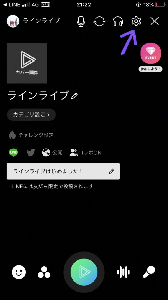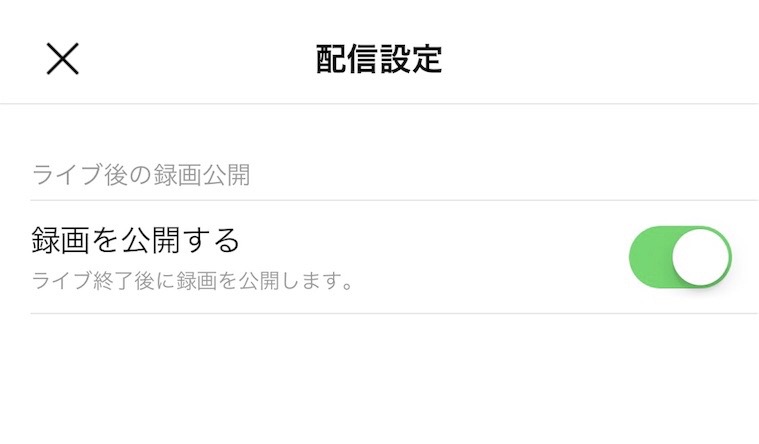 配信後にアーカイブを残すには、配信画面の設定ボタンをタップし、「録画を公開する」をオンに設定します。
