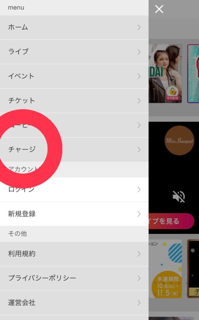 まず、ミクチャアプリ内のマイページ(人型のアイコン)を開き、「チャージする」をタップします。