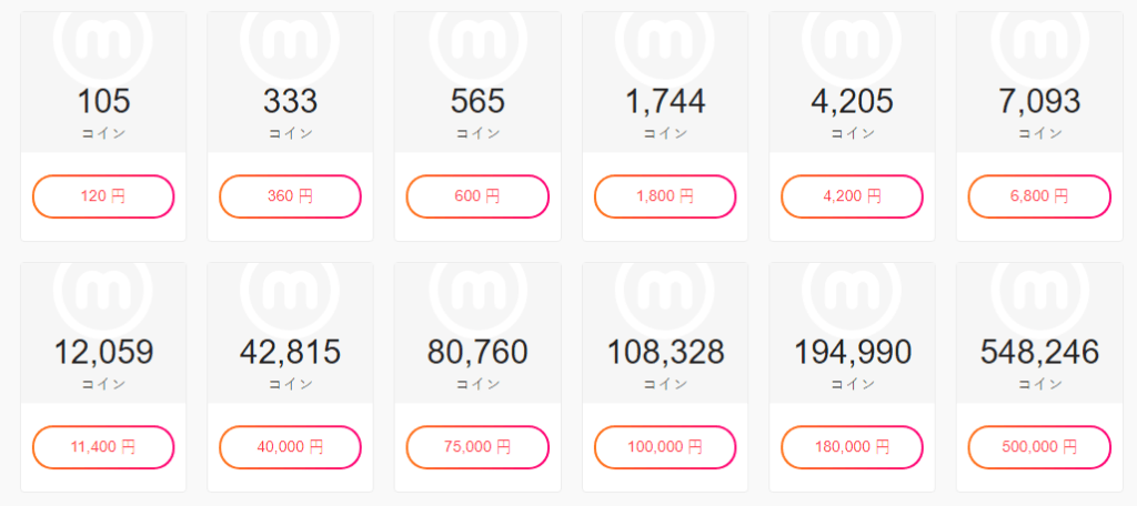 まず、こちらがアプリ版のミクチャでコインをチャージする際の料金表示です。