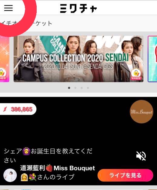 まず、ミクチャのサイトを開いてログインし、ホーム画面から左上の「三本線アイコン」をタップします。