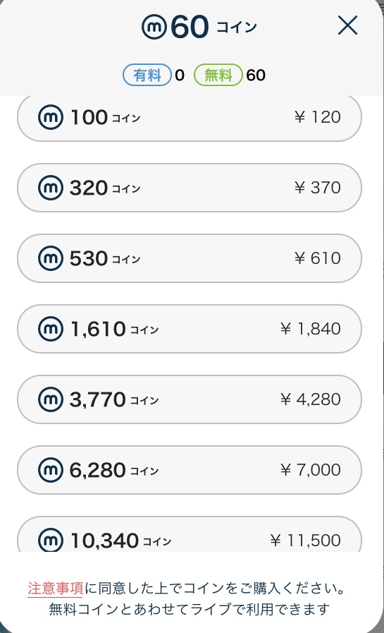 コインの料金と対応する枚数の一覧が表示されますので、欲しい枚数を選んでタップします。
