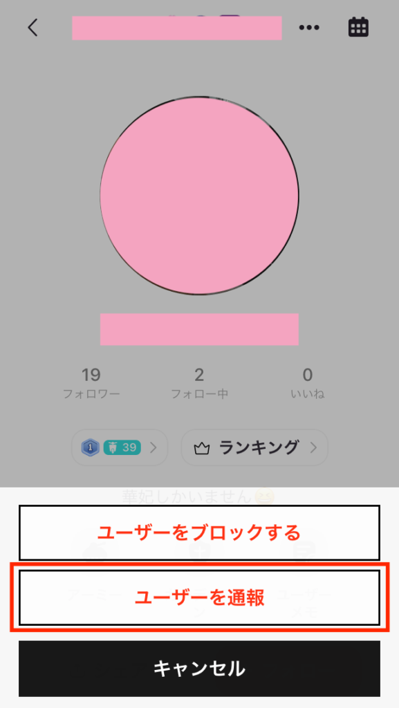 「ユーザーを通報」という表示が出てきたら、そちらをタップします。この時、「ユーザーをブロックする」をタップすると、ユーザーをブロックすることができます。