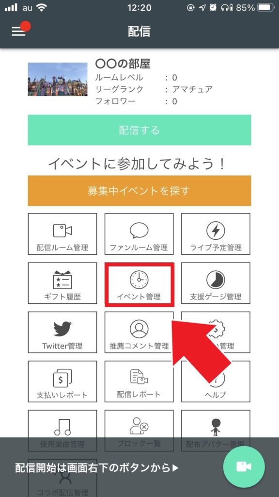 ⑨配信管理画面に戻り、再度「イベント管理」をタップ