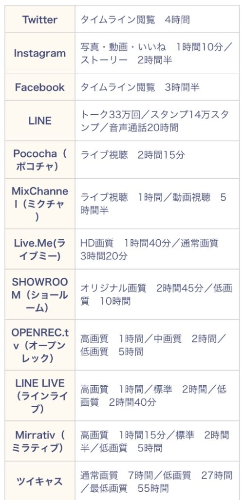 SNSに比べ、ライブ配信サービスなどは通信量が多くかかっていることがわかります。